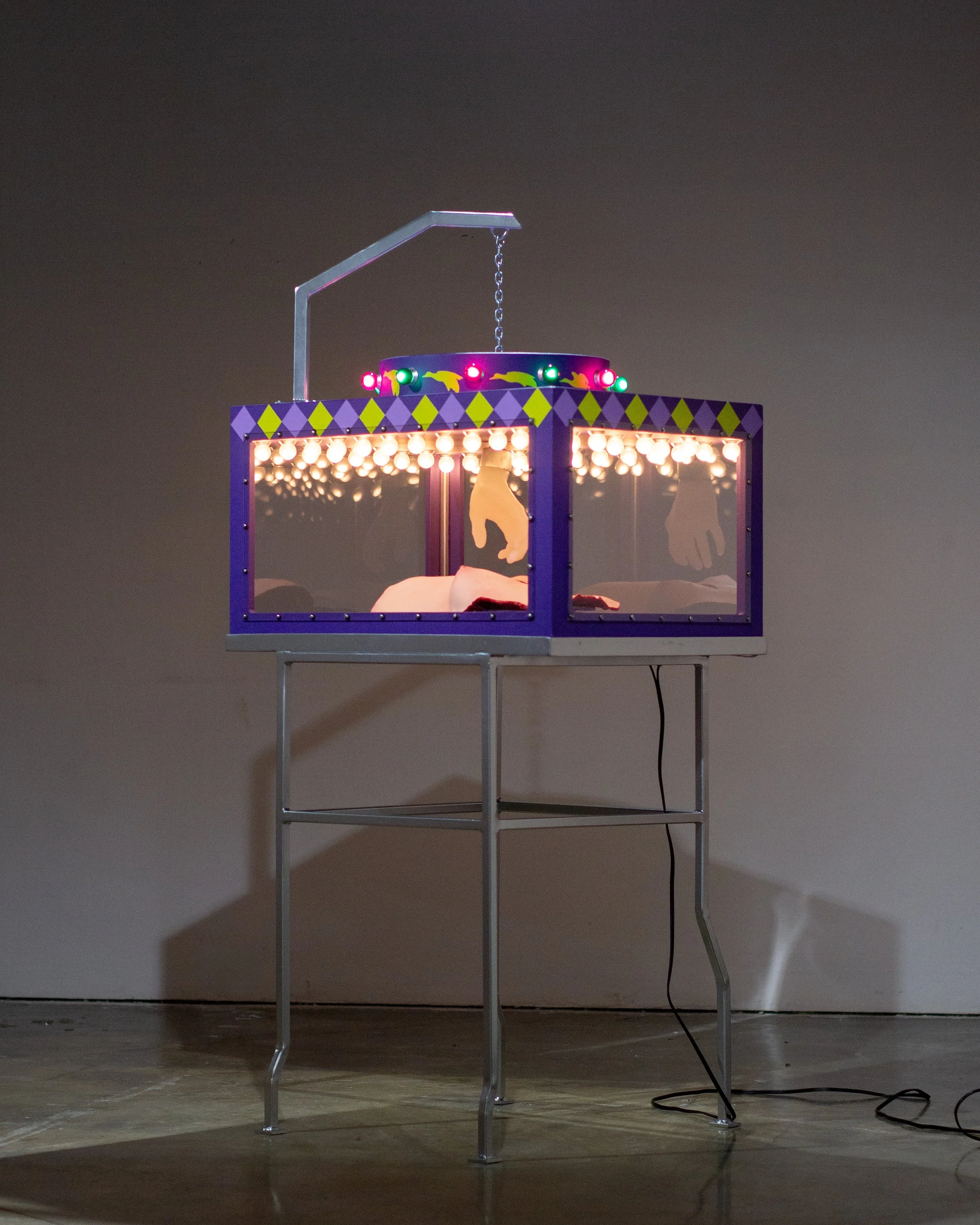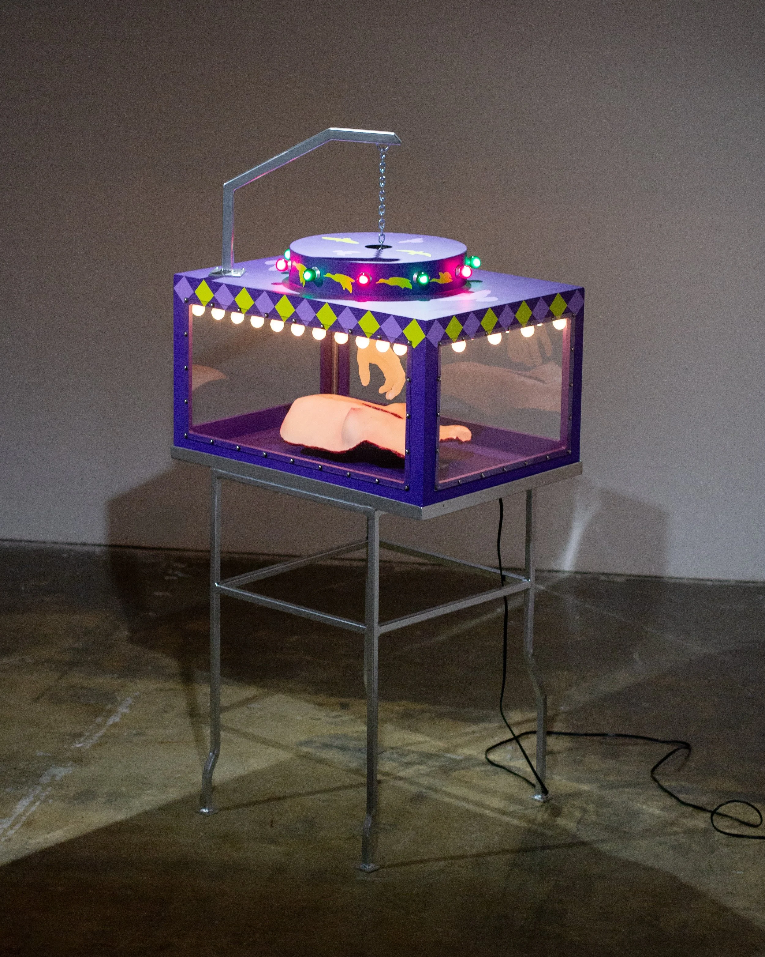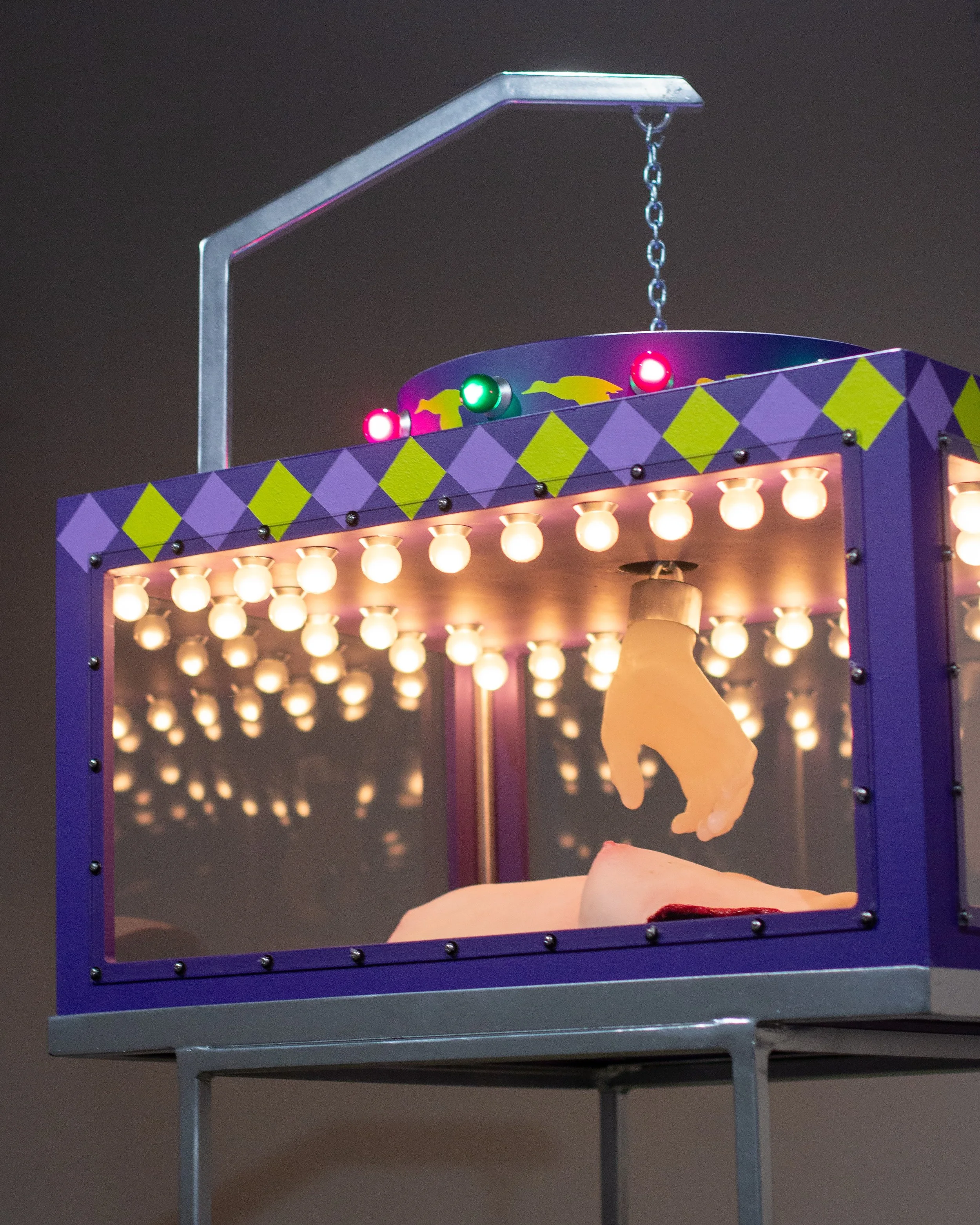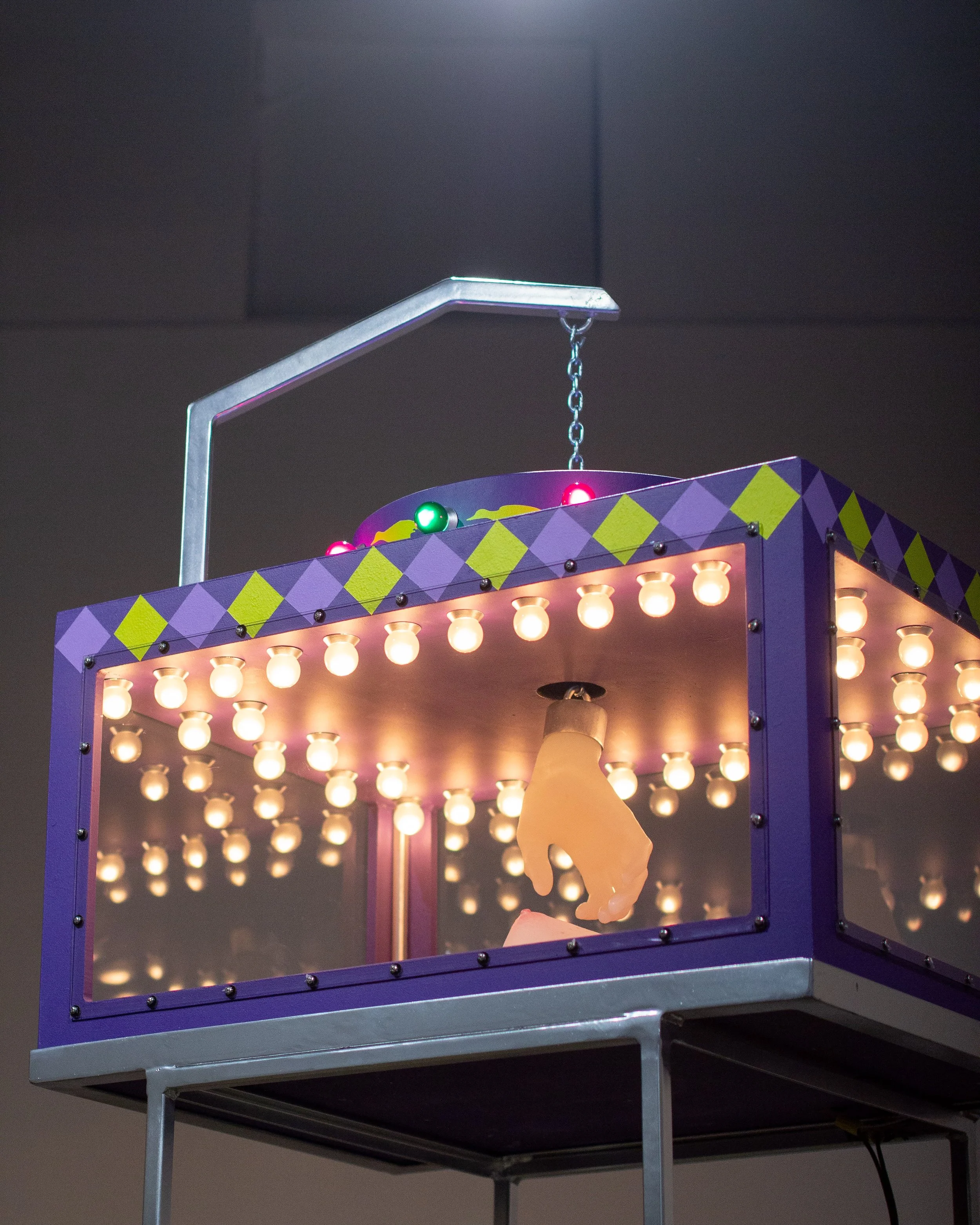Silicone, plywood, steel, polycarbonate, latex acrylic paint, lightbulbs, chain