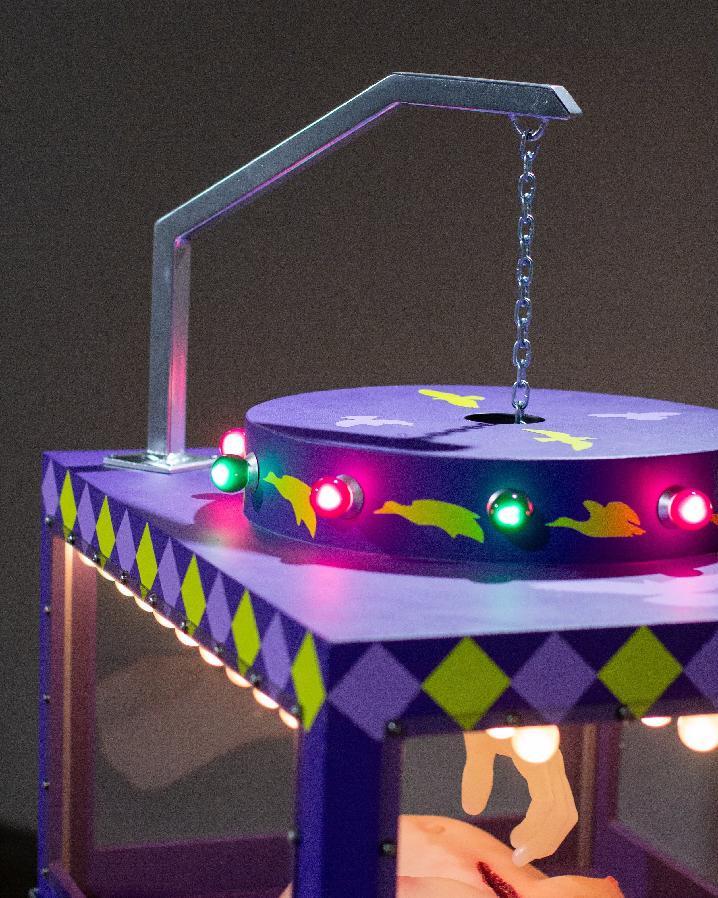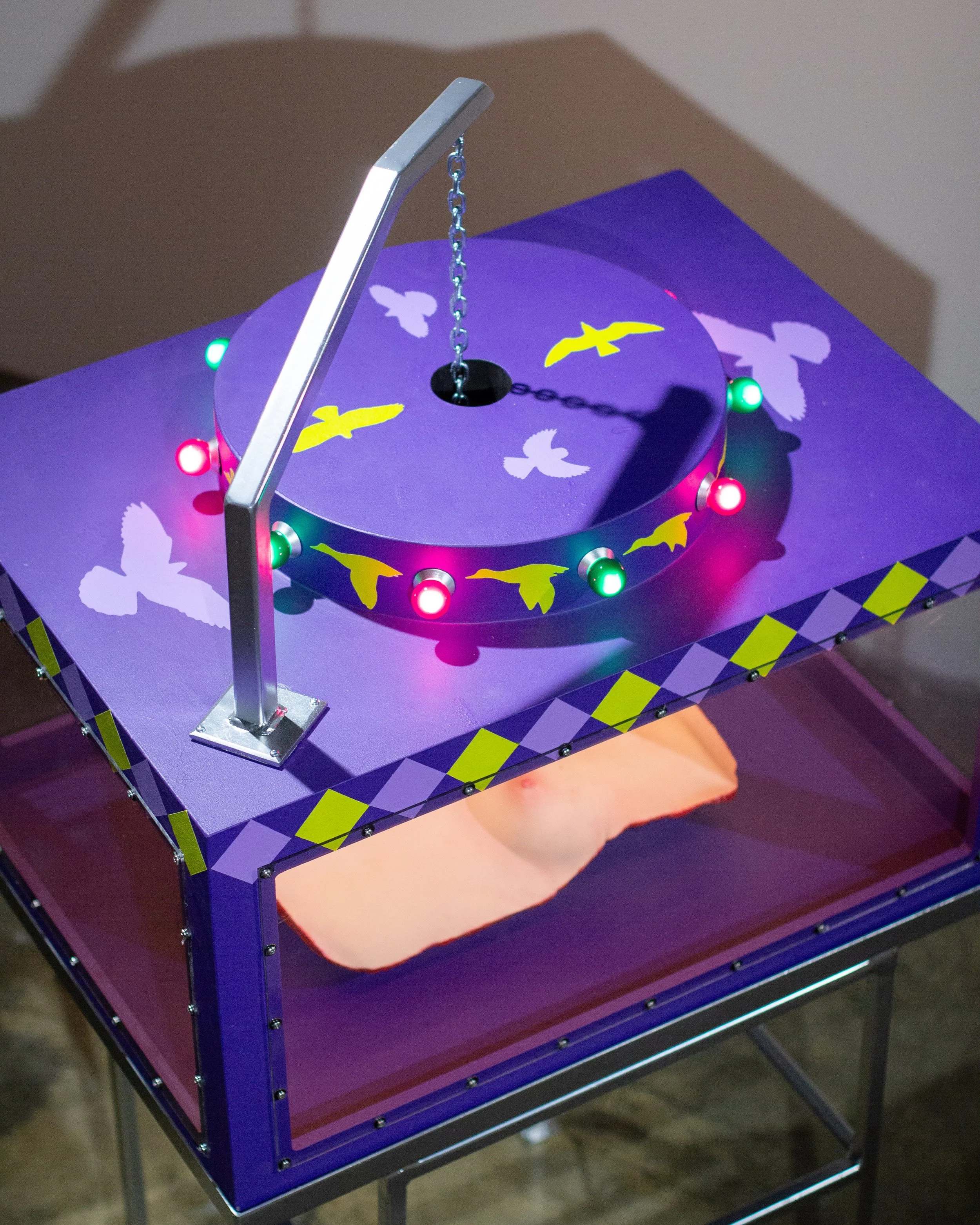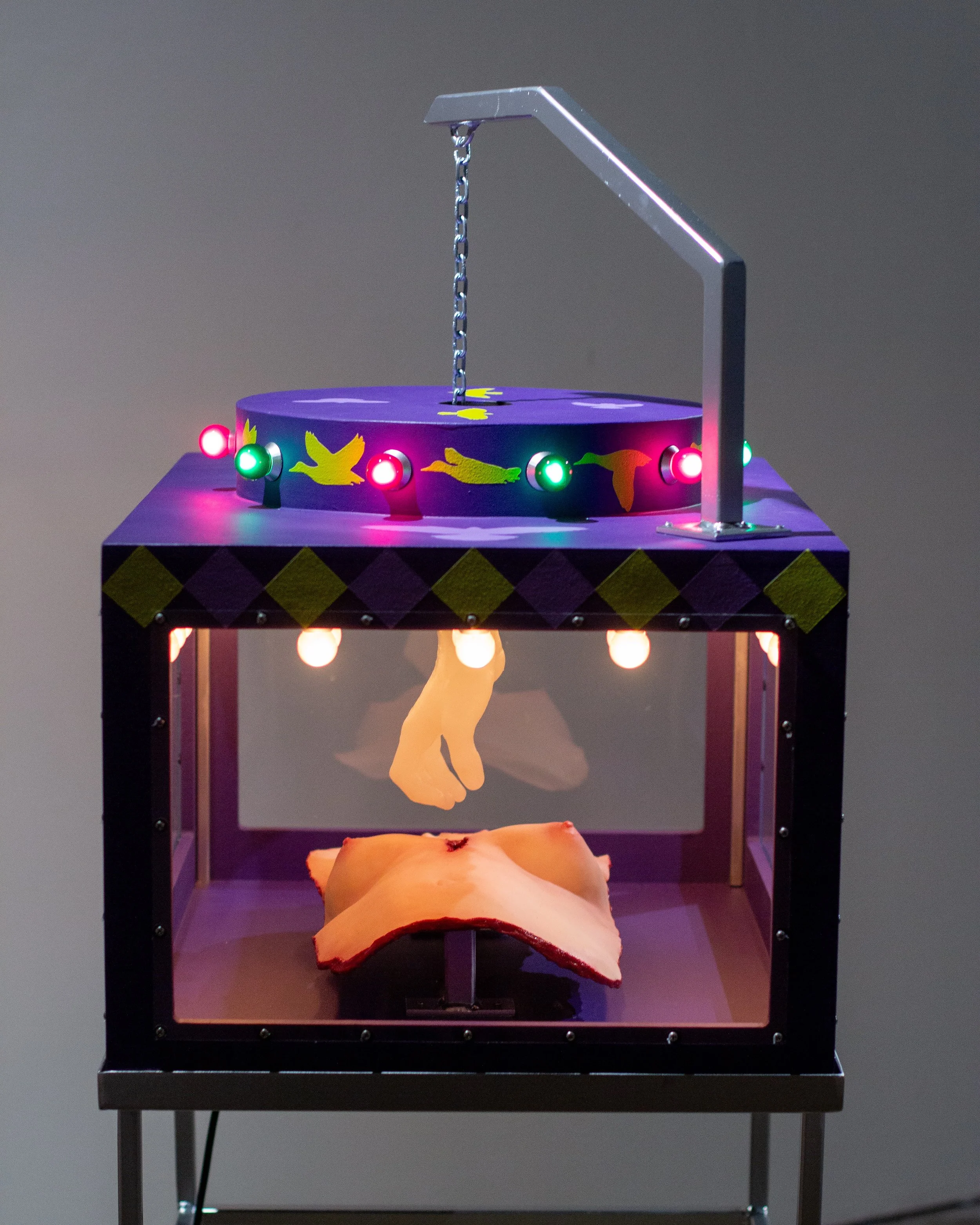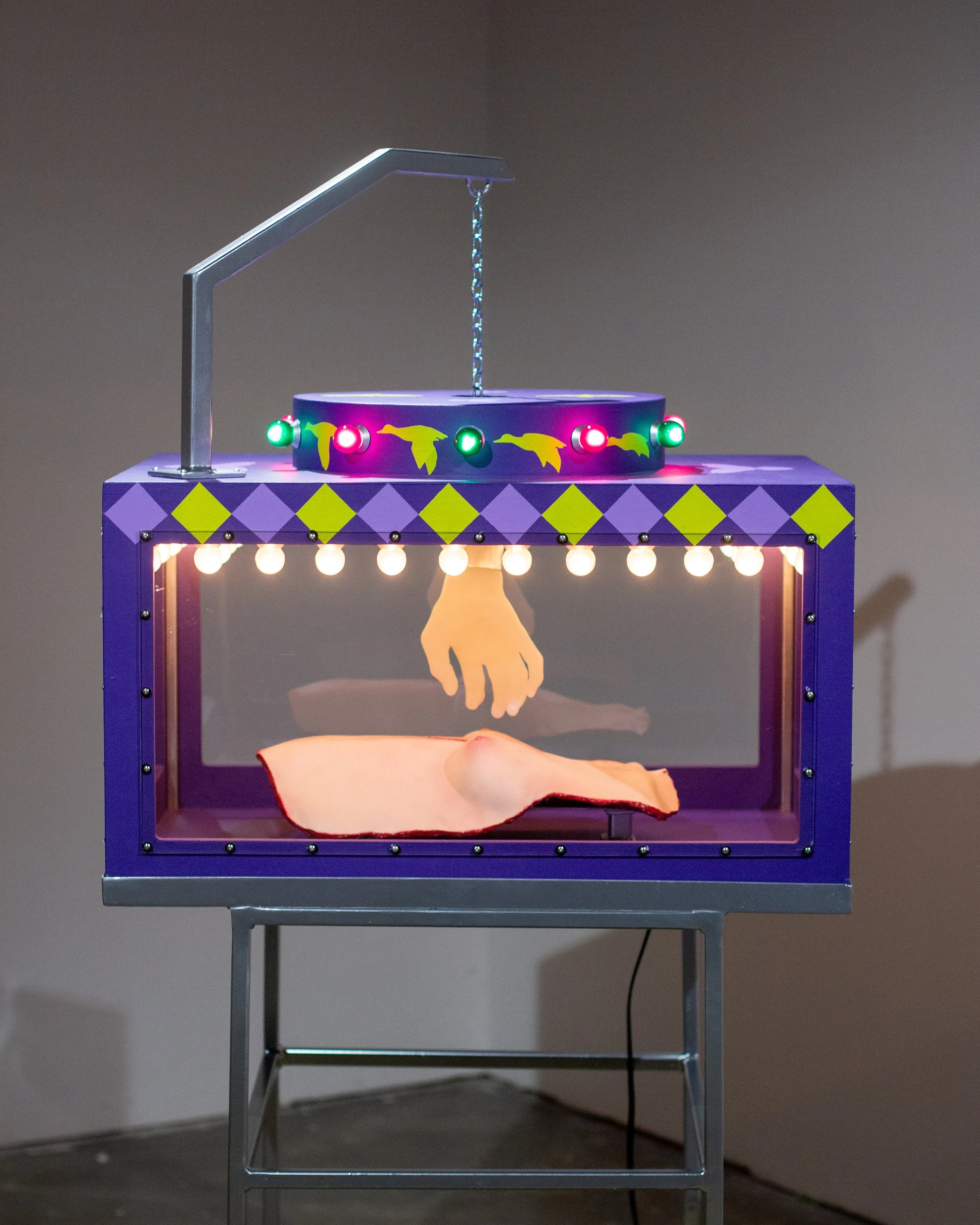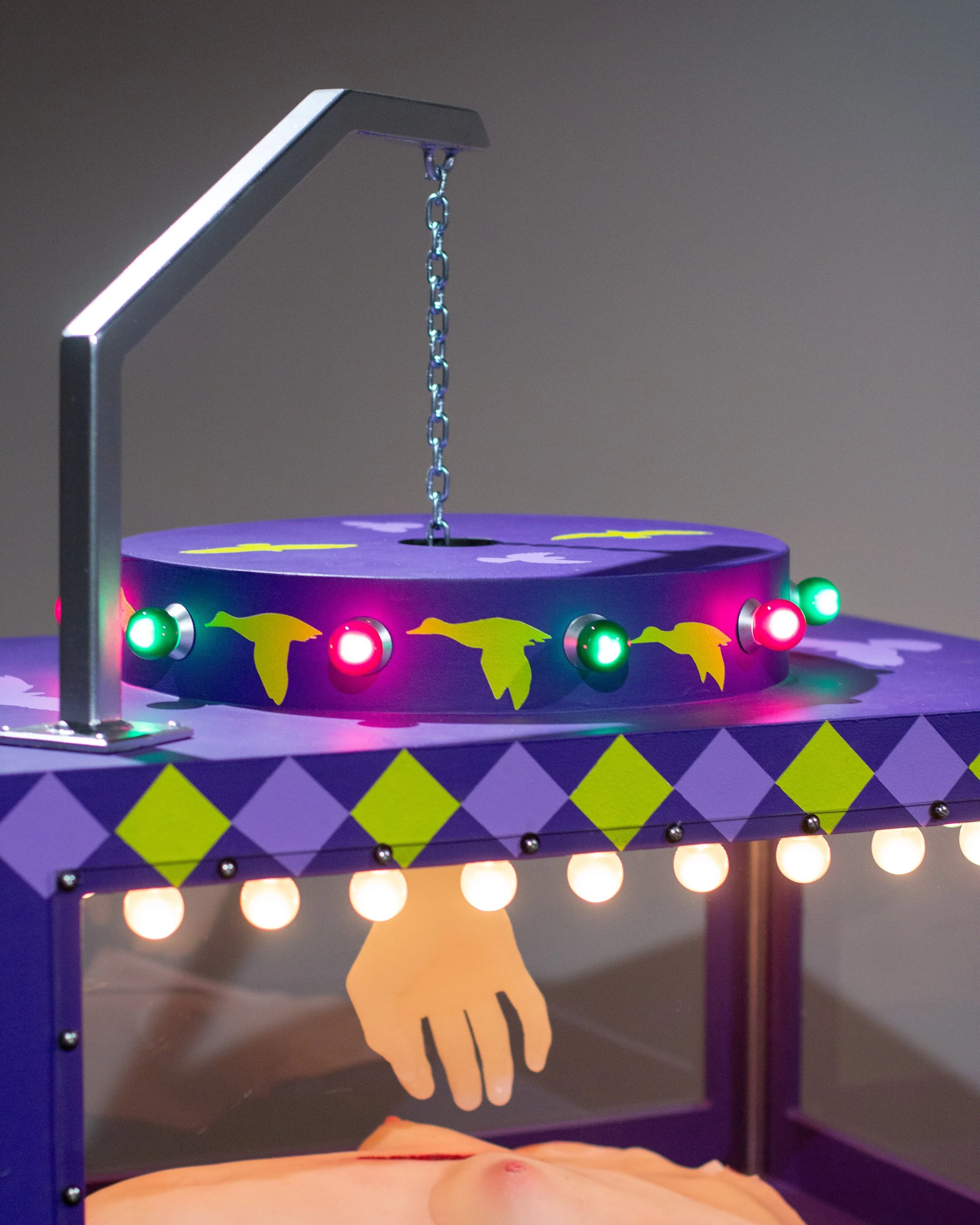 Silicone, plywood, steel, polycarbonate, latex acrylic paint, lightbulbs, chain