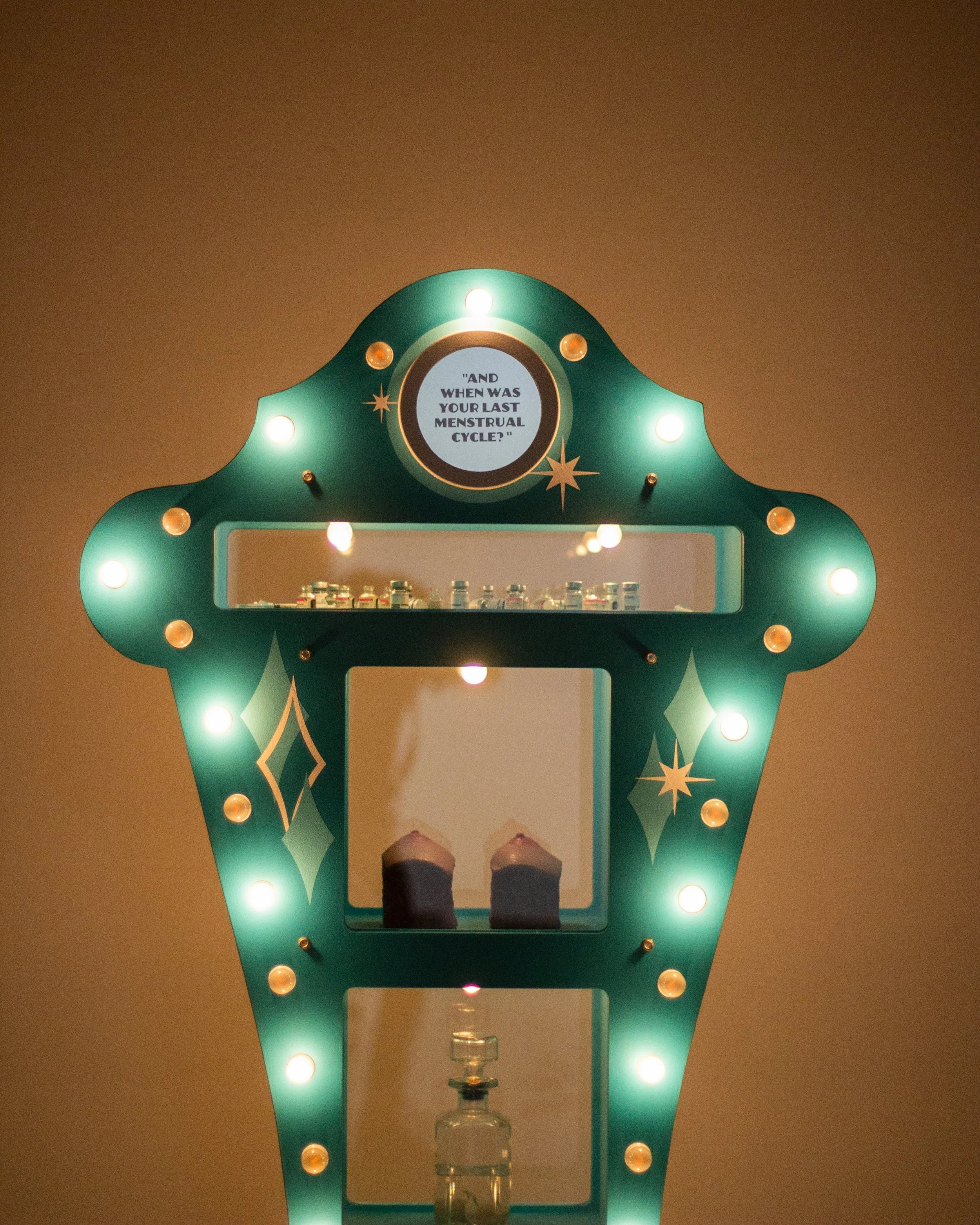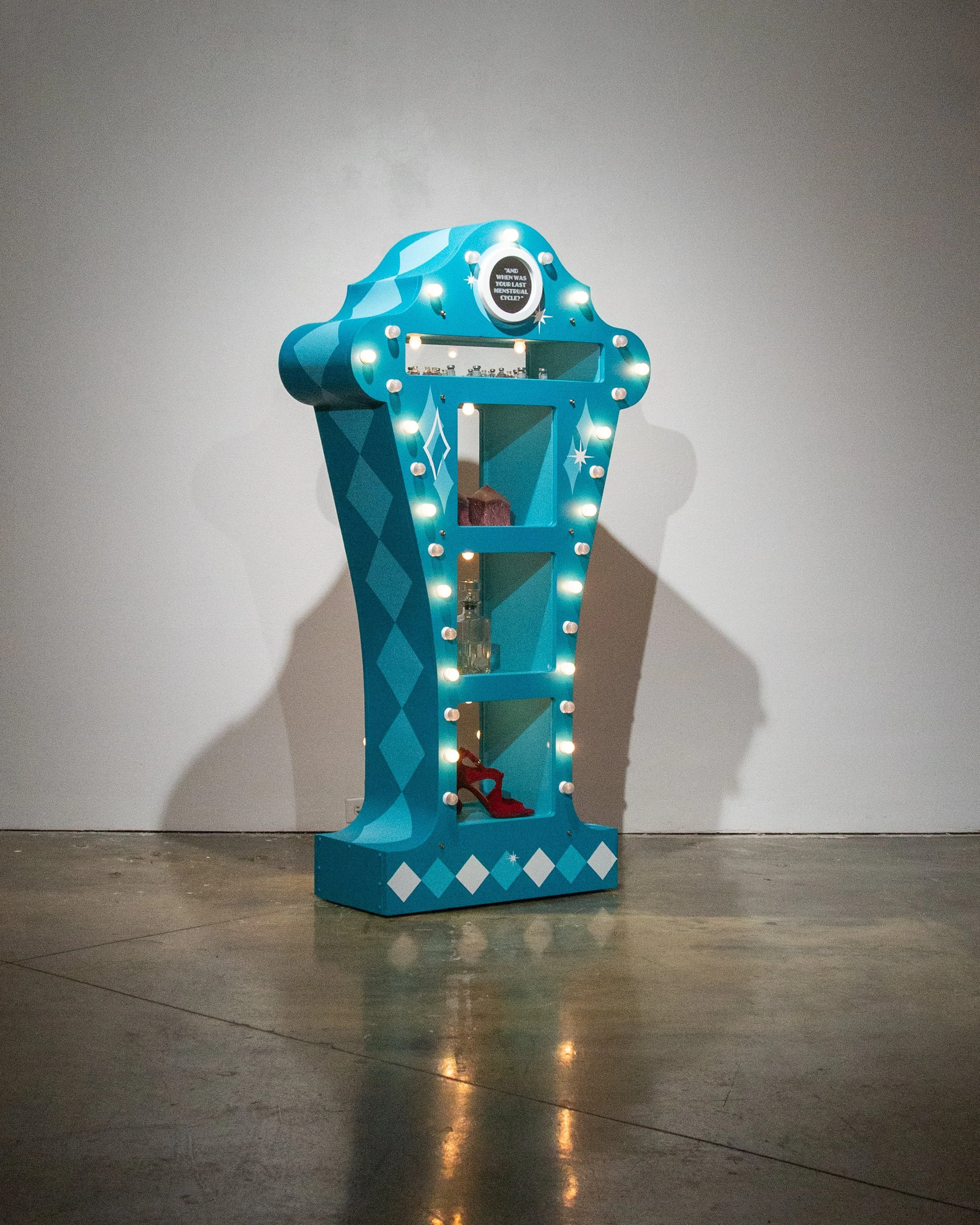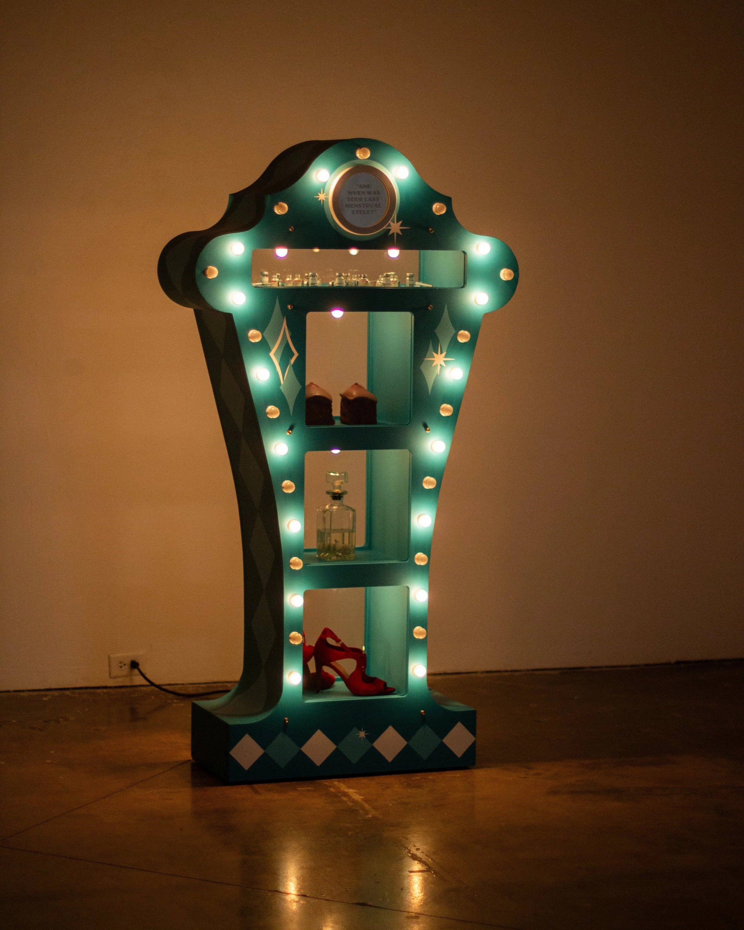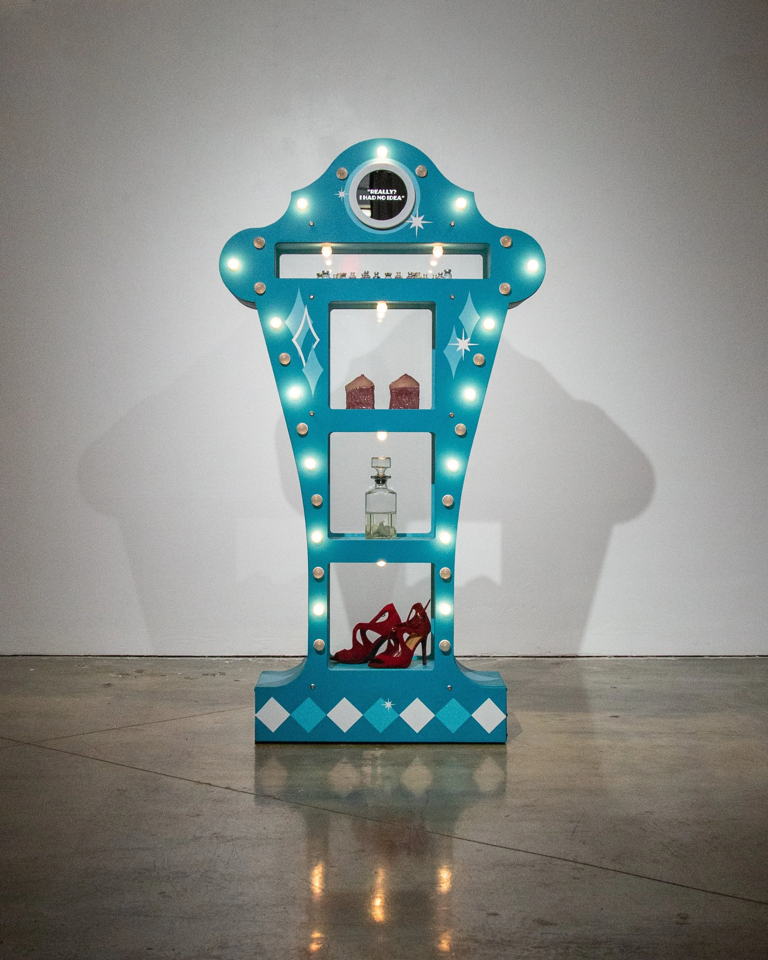 MDF, silicone, light bulbs, found objects, estrogen vials, high heels, latex acrylic paint, sandblasted mirrors