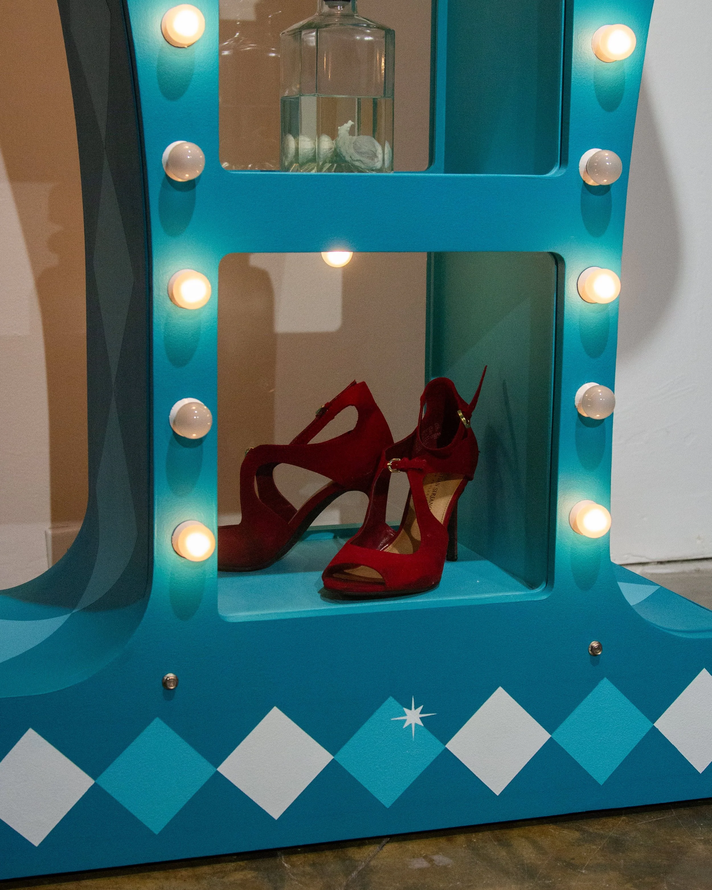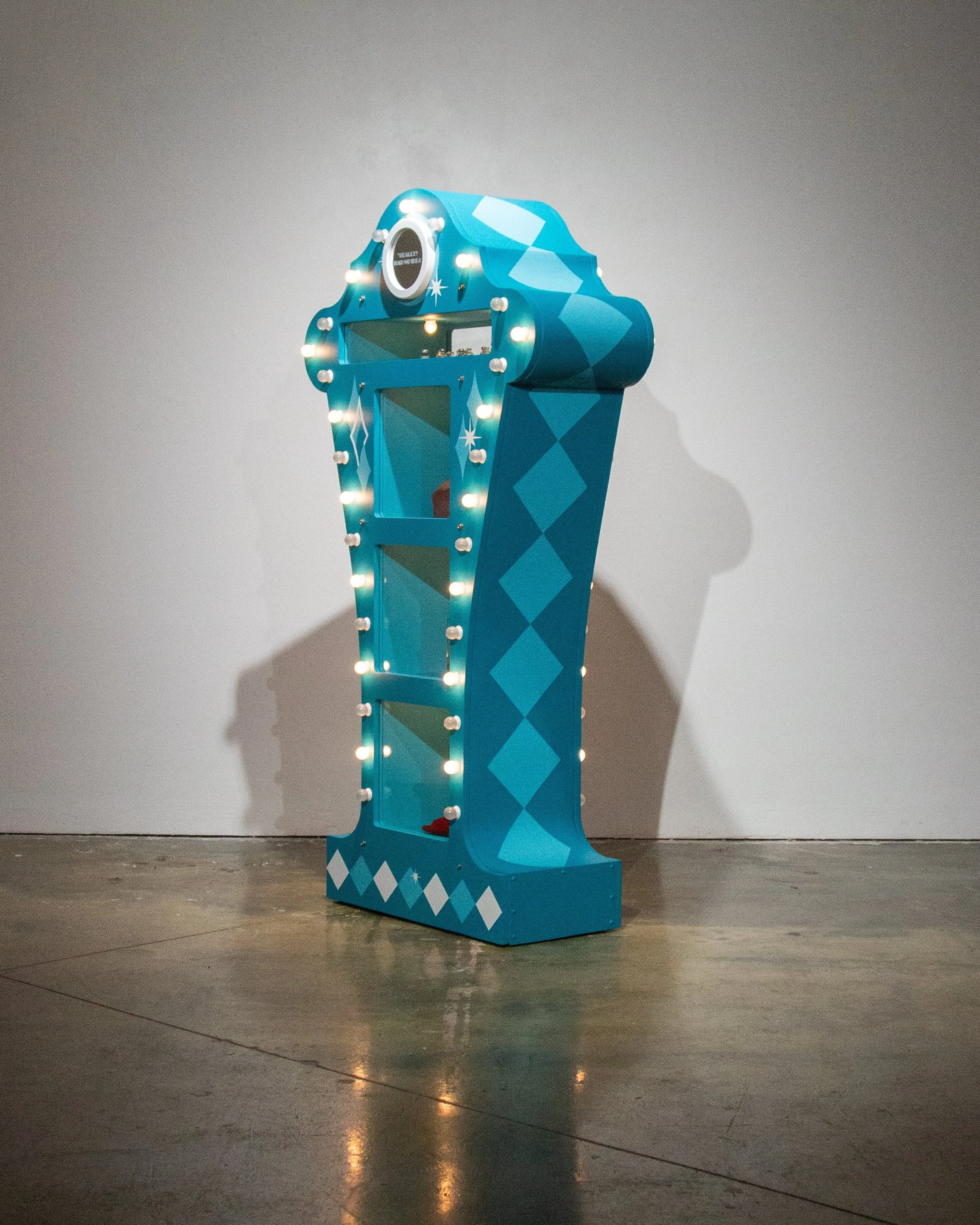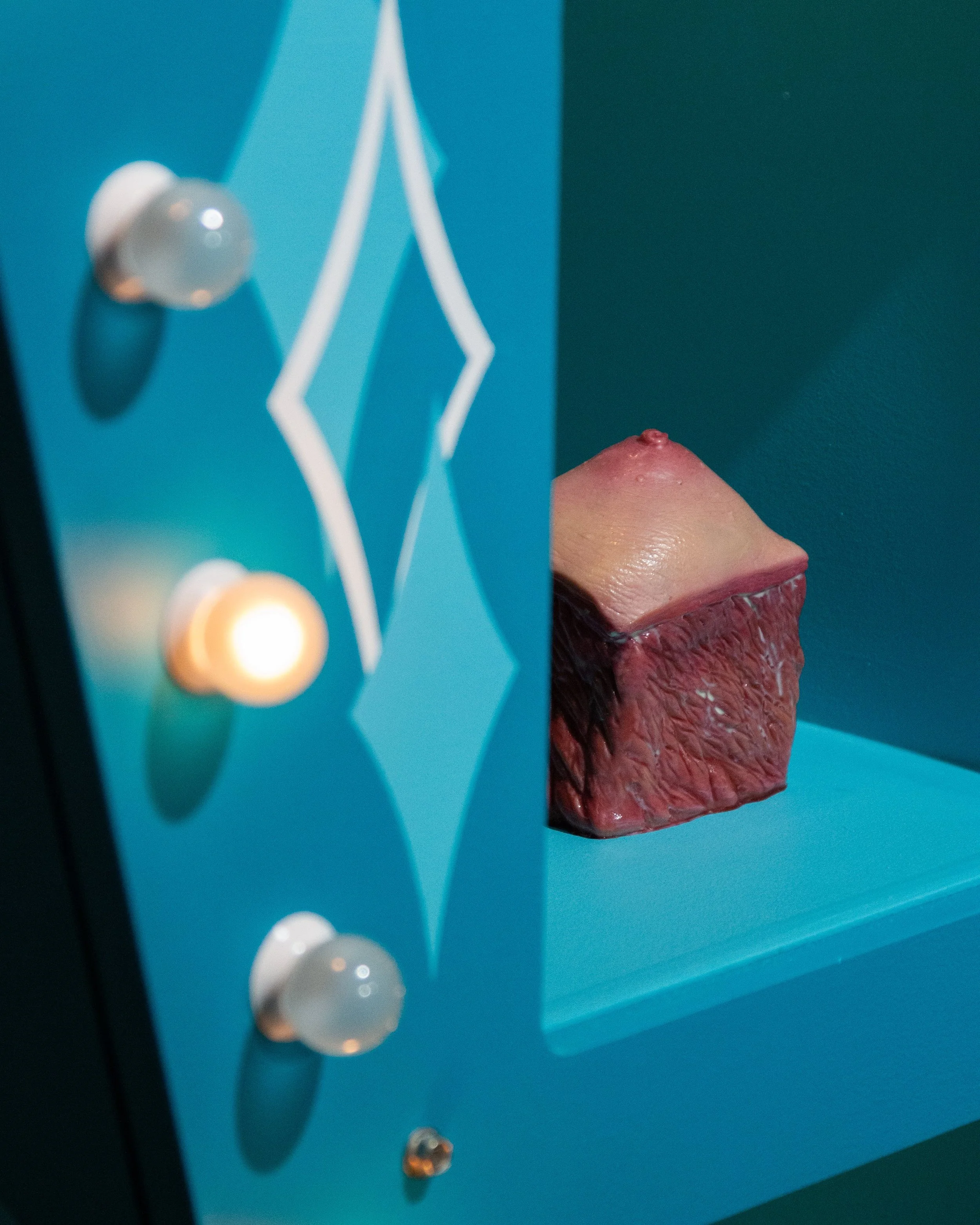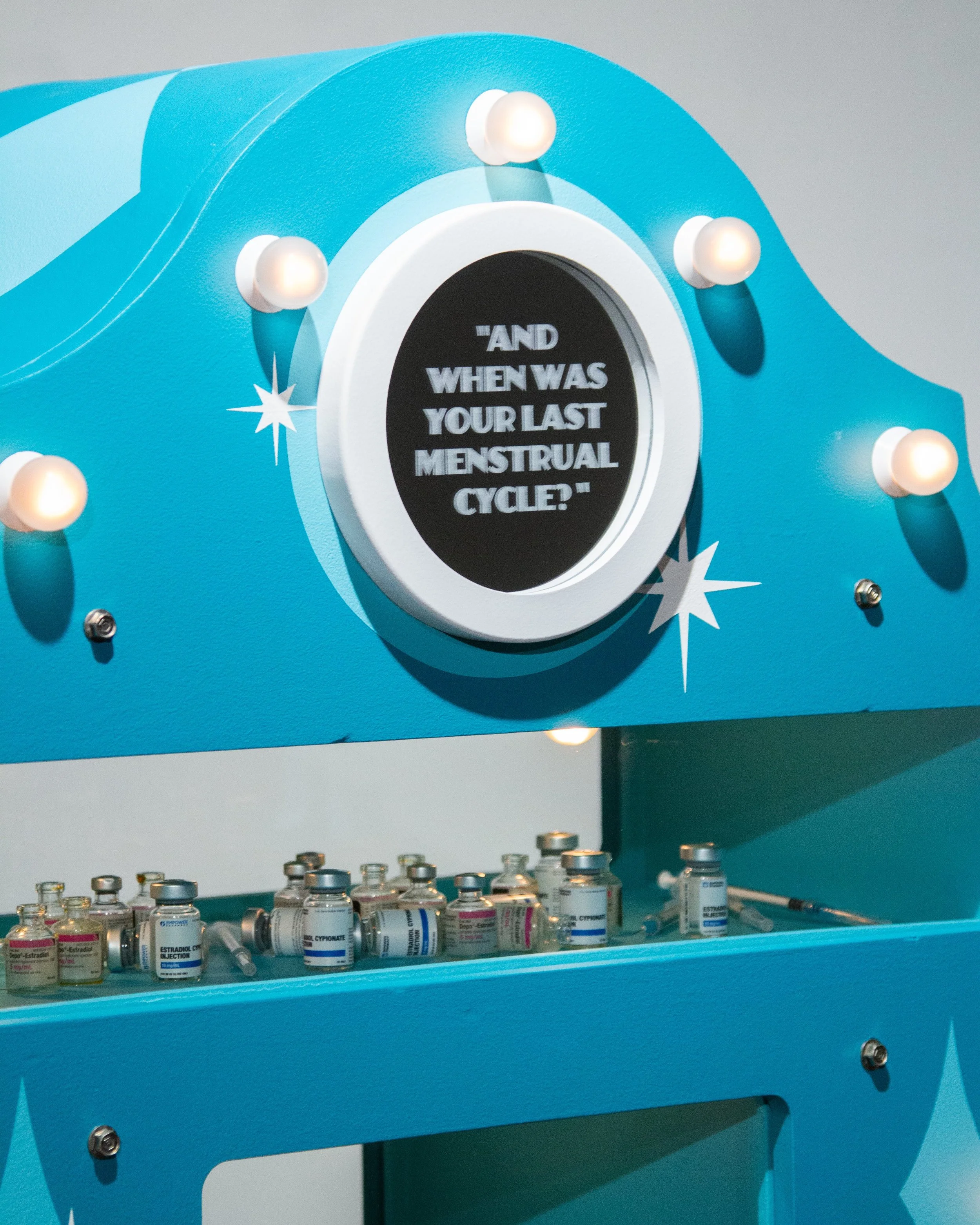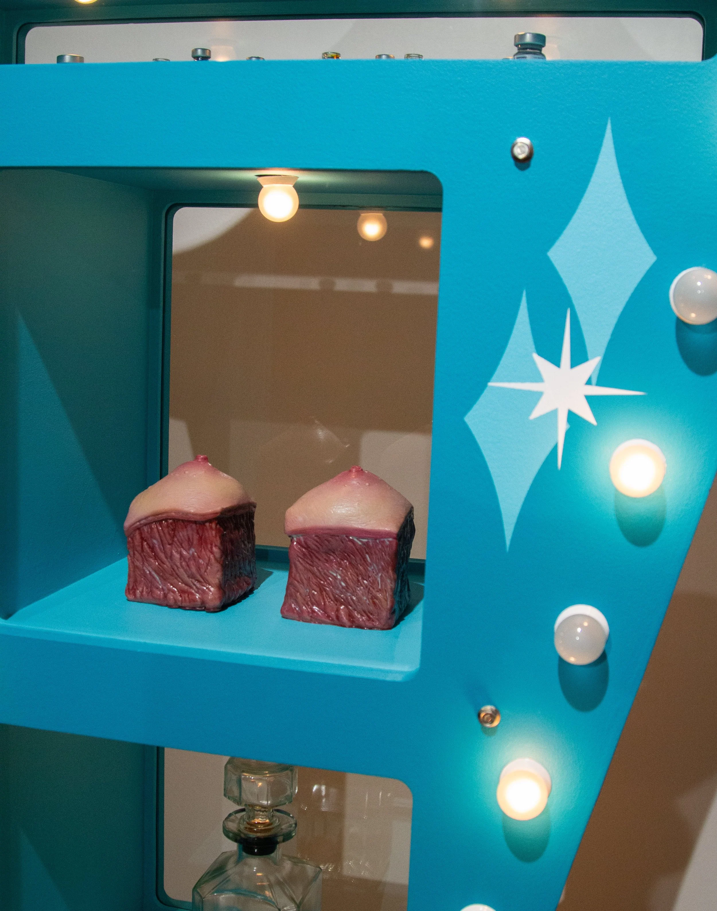 MDF, silicone, light bulbs, found objects, estrogen vials, high heels, latex acrylic paint, sandblasted mirrors