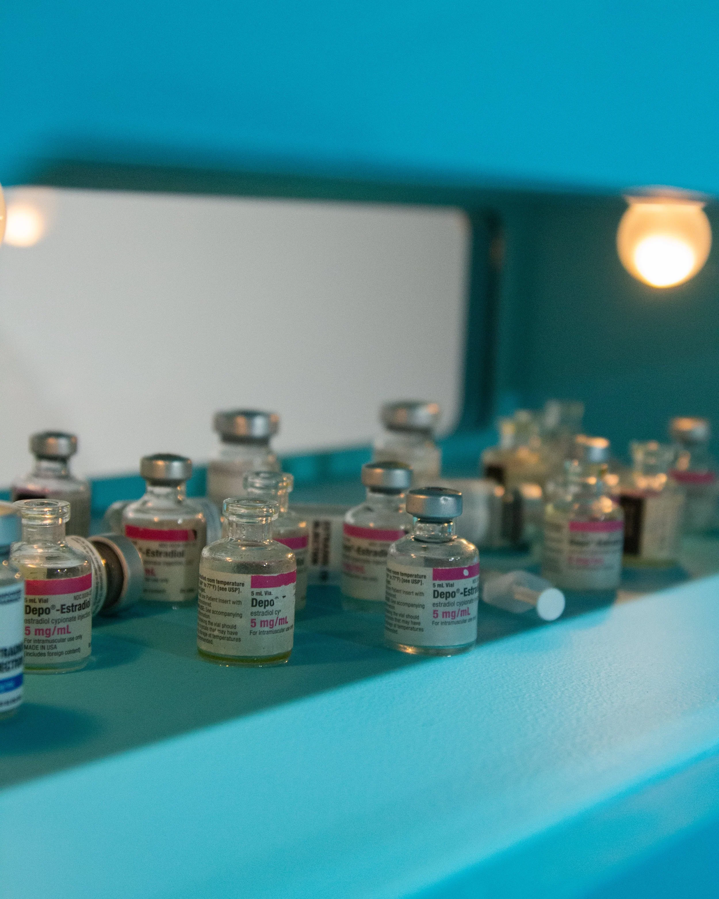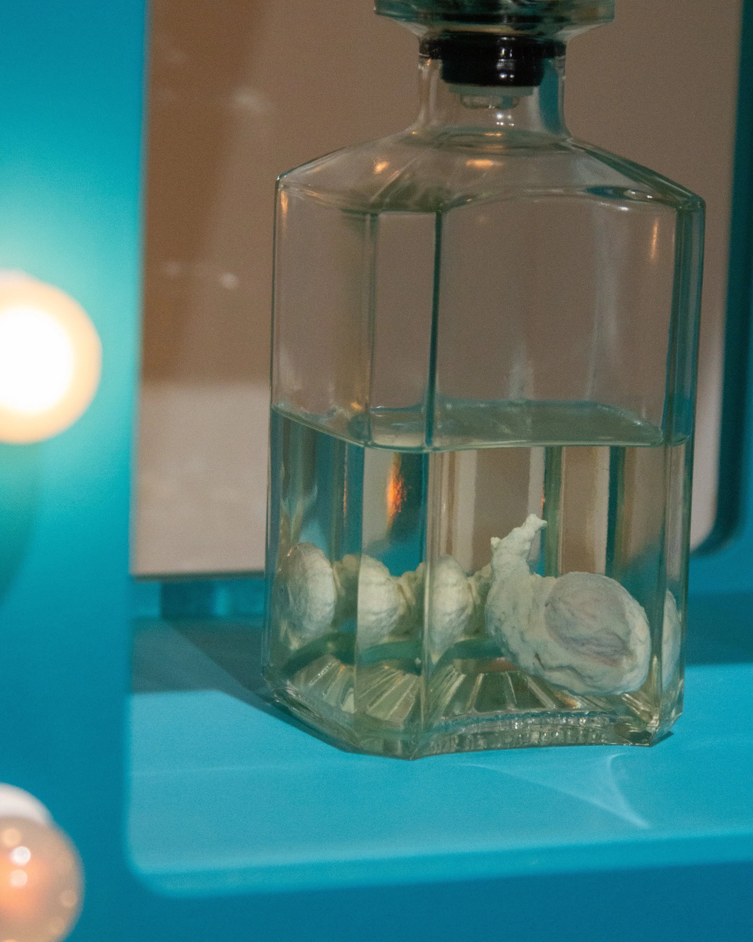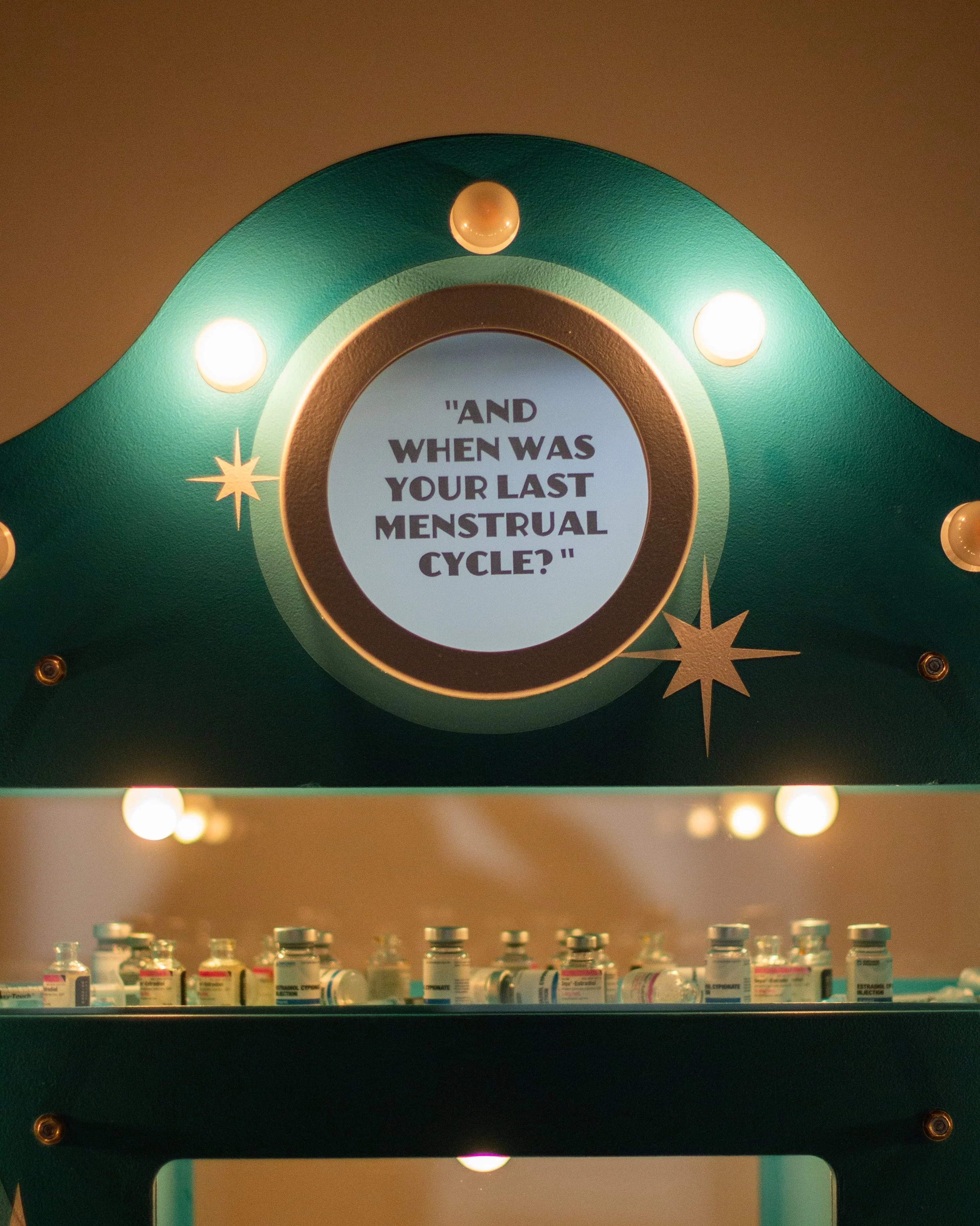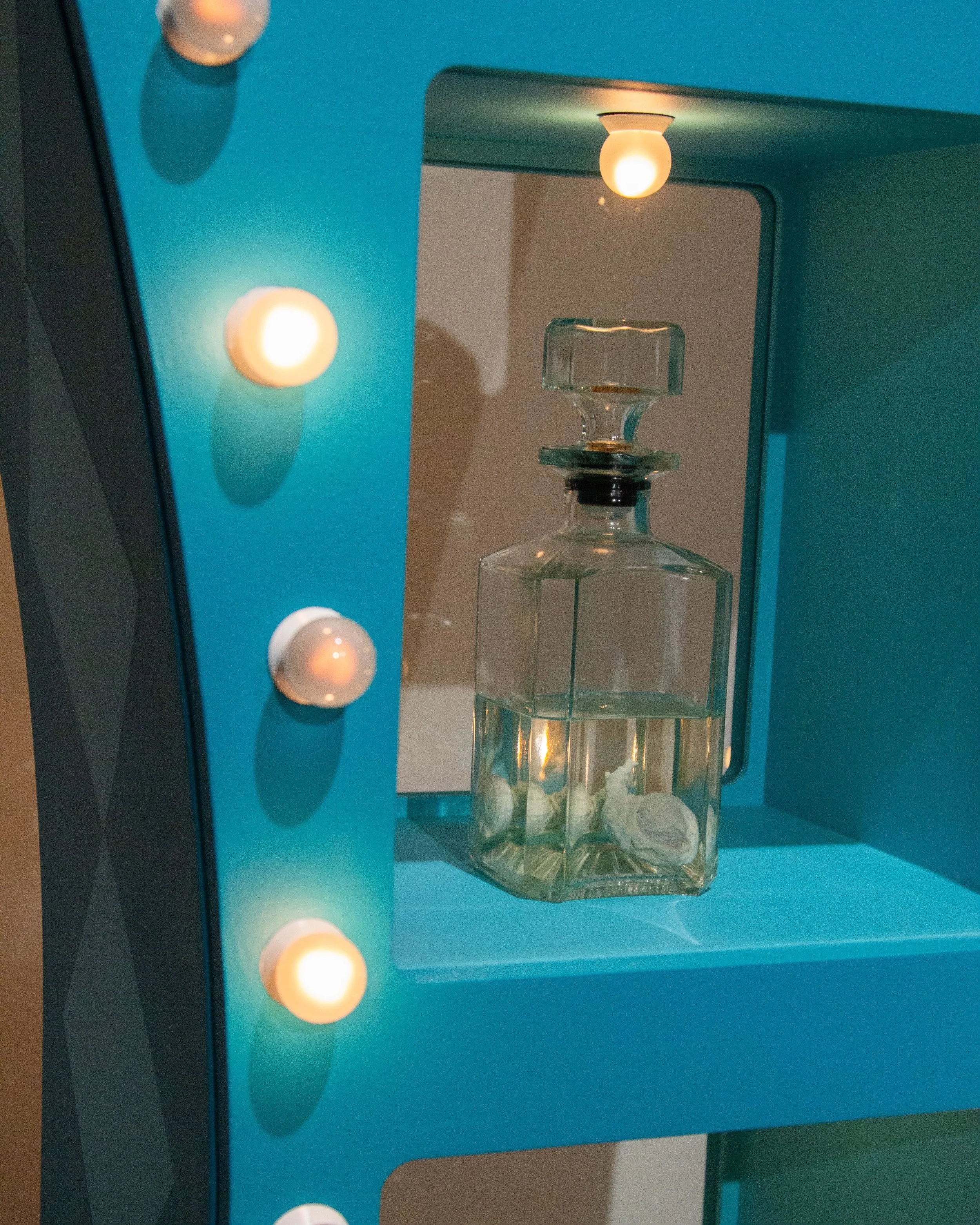 MDF, silicone, light bulbs, found objects, estrogen vials, high heels, latex acrylic paint, sandblasted mirrors